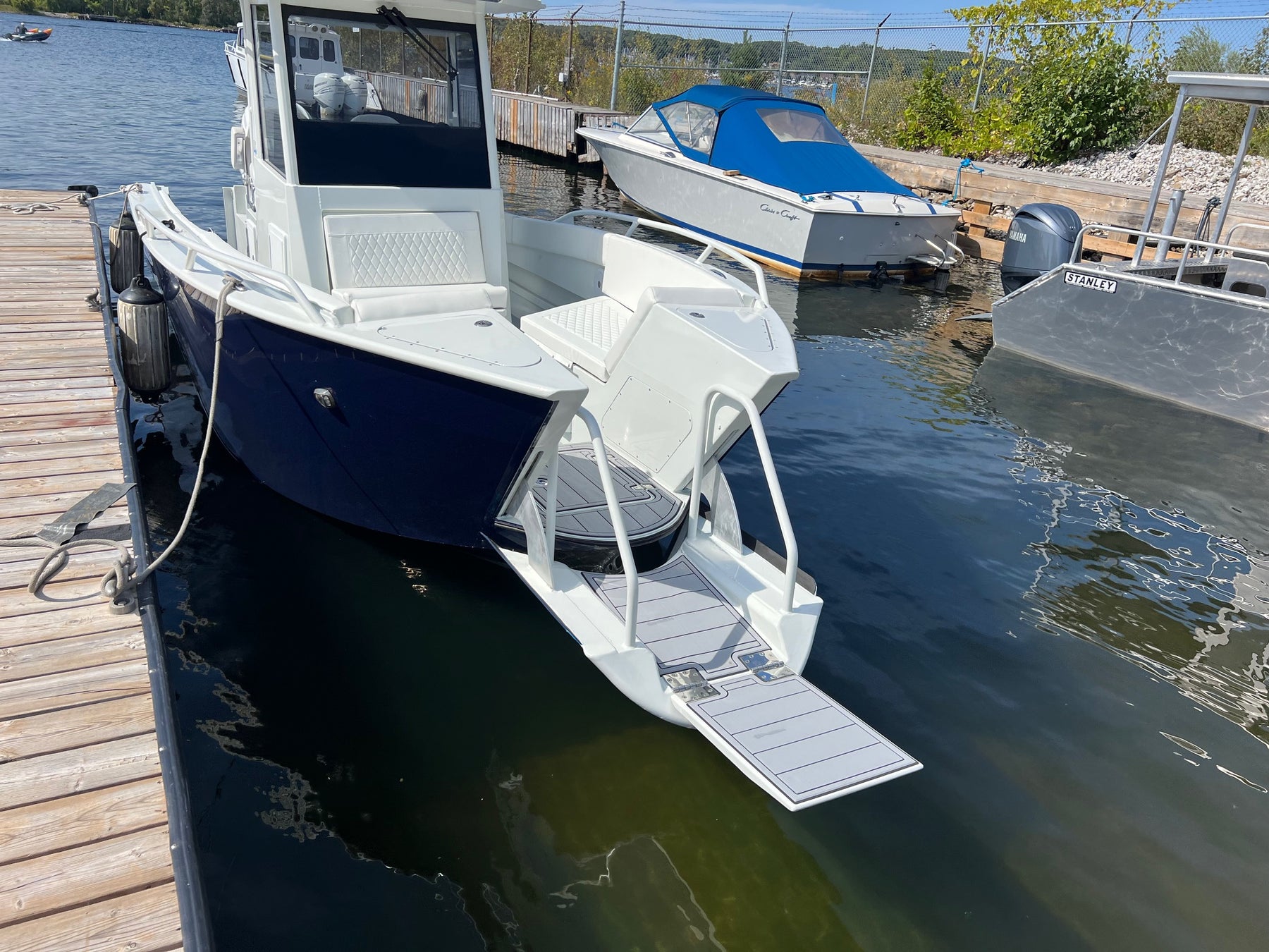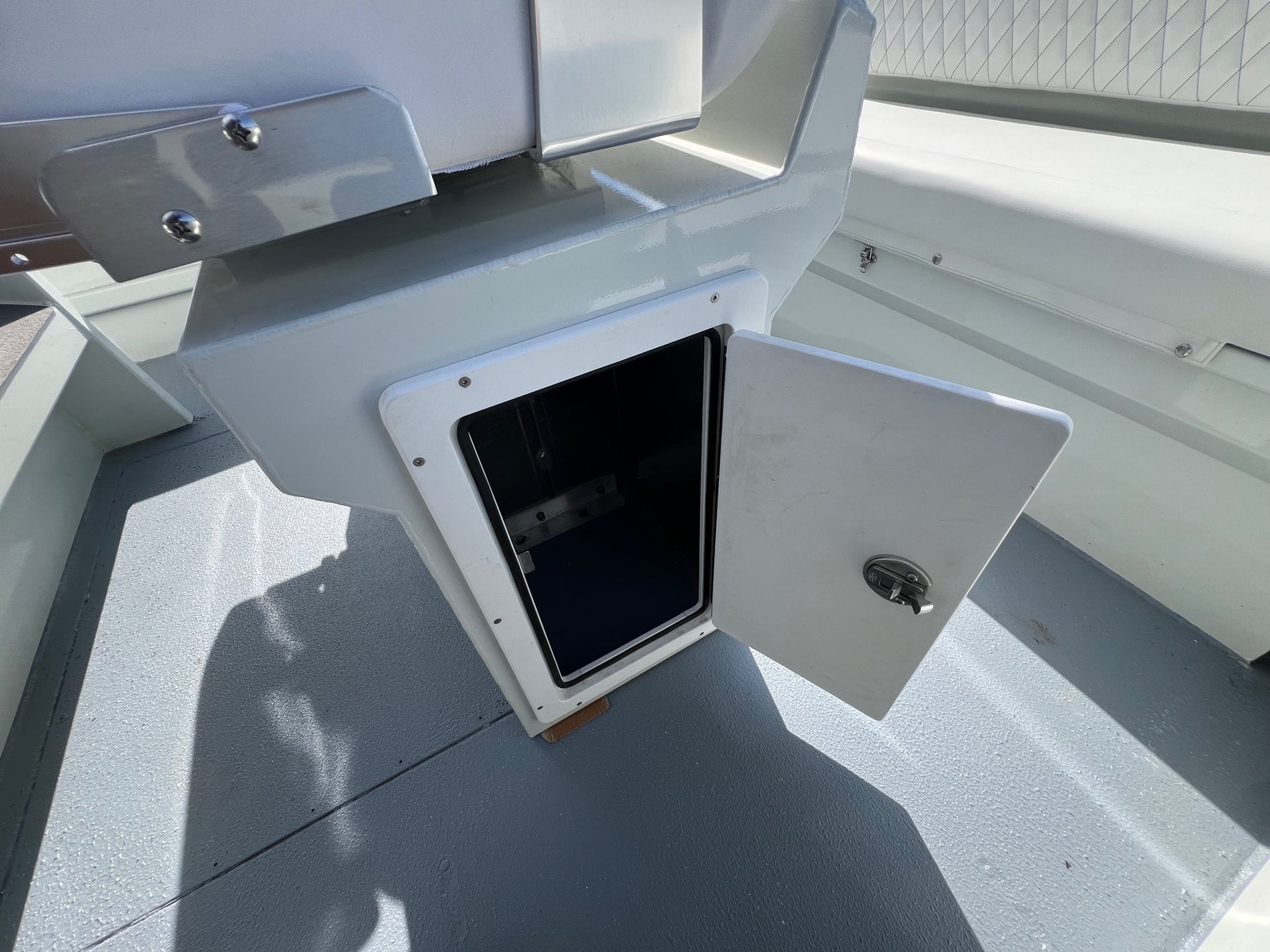 There is tons of storage on this boat & it looks amazing with its unique blue & white paint job.