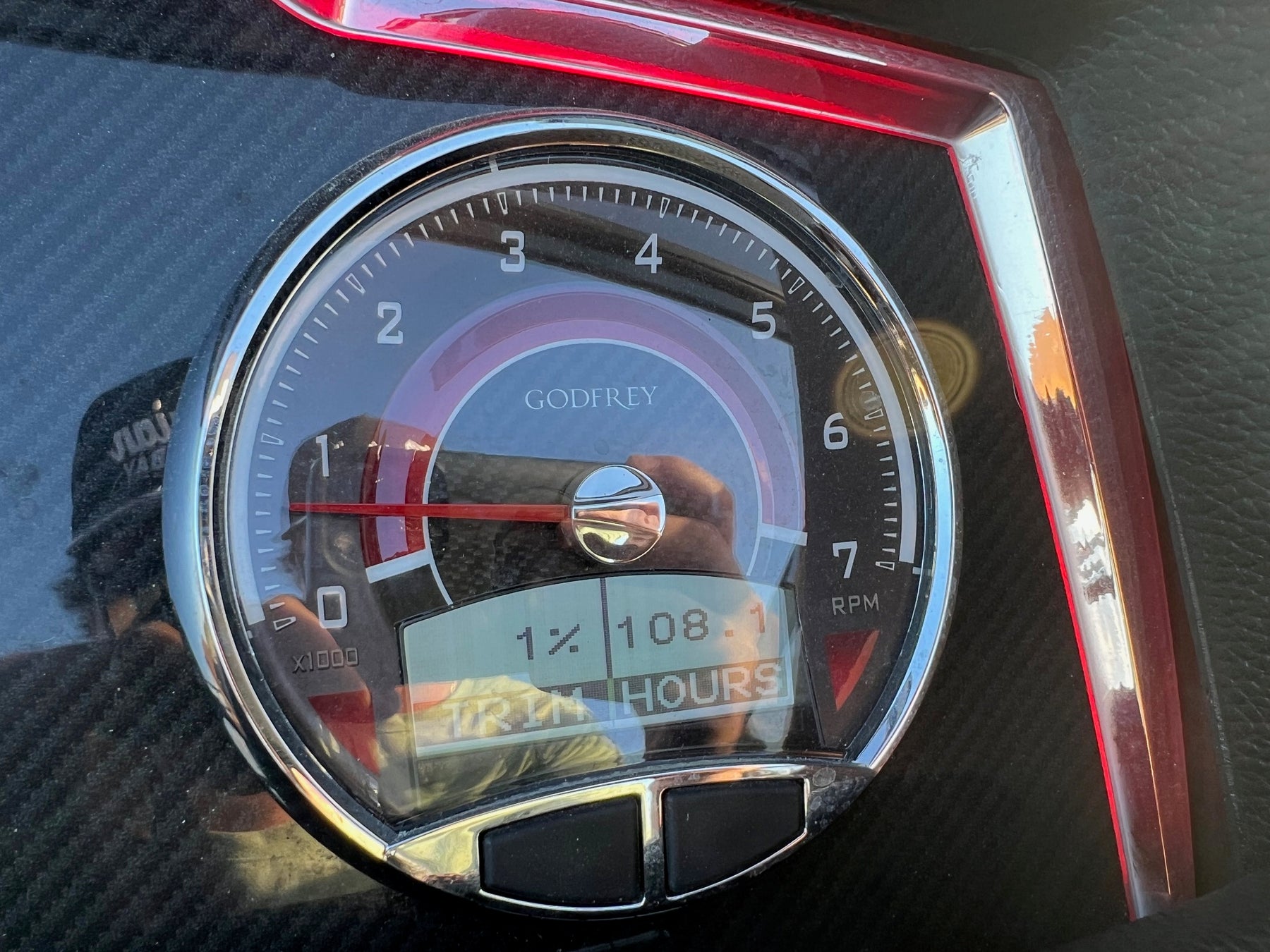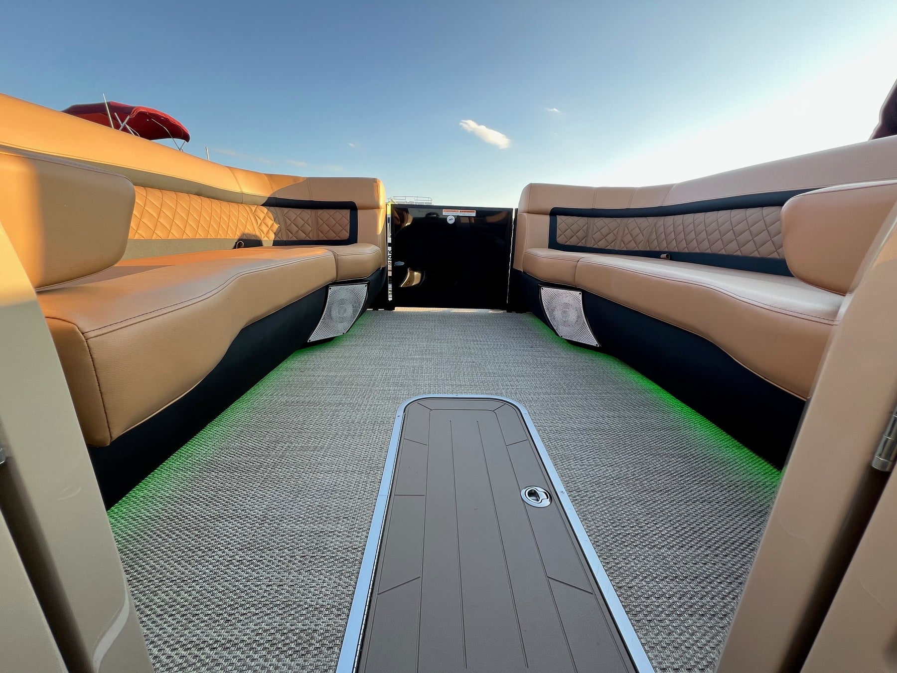You need to check out this one-of-a-kind Tritoon, 2021 Godfrey AquaPatio 255. It's fully loaded and powered with a Mercury 400 Verado with only 108 hours. This Tritoon has been stored in a boathouse since new.